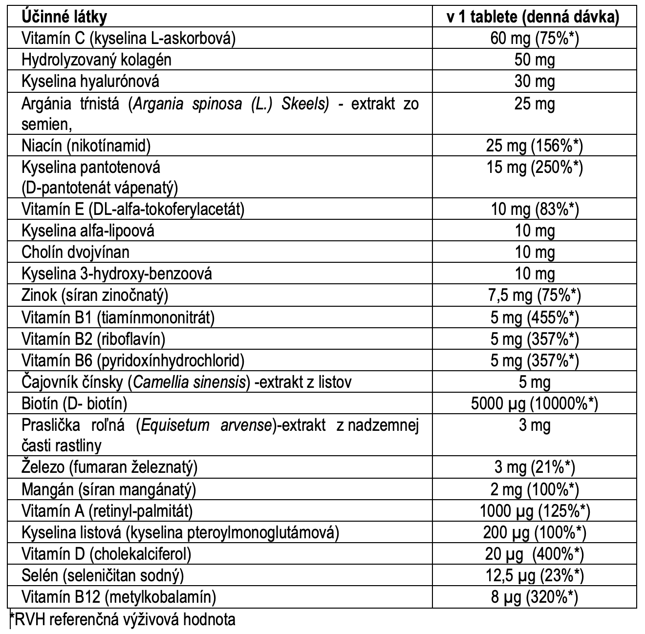 Zloženie: emulgátor: mikrokryštalická celulóza; rastlinná kapsula (hydroxypropylmetylcelulóza), vitamín C (kyselina L-askorbová), hydrolyzovaný kolagén, vitamín E (DL-alfa-tokoferylacetát), kyselina hyalurónová, niacín (nikotínamid), argánia tŕnistá (Argania spinosa (L.) Skeels) - extrakt zo semien, cholín dvojvínan, zinok (síran zinočnatý), kyselina pantotenová (D-pantotenát vápenatý), emulgátor: horečnaté soli mastných kyselín; kyselina 3-hydroxy-benzoová, kyselina alfa-lipoová, železo (fumaran železnatý), vitamín A (retinylpalmitát), vitamín B1 (tiamínmononitrát), vitamín B6 (pyridoxínhydrochlorid), mangán (síran mangánatý), vitamín B2 (riboflavín), biotín (D-biotín), čajovník čínsky (Camellia sinensis) -extrakt z listov, praslička roľná (Equisetum arvense)-extrakt z nadzemnej časti rastliny, kyselina listová (kyselina pteroylmonoglutámová), selén (seleničitan sodný), vitamín D (cholekalciferol), vitamín B12 (metylkobalamín).