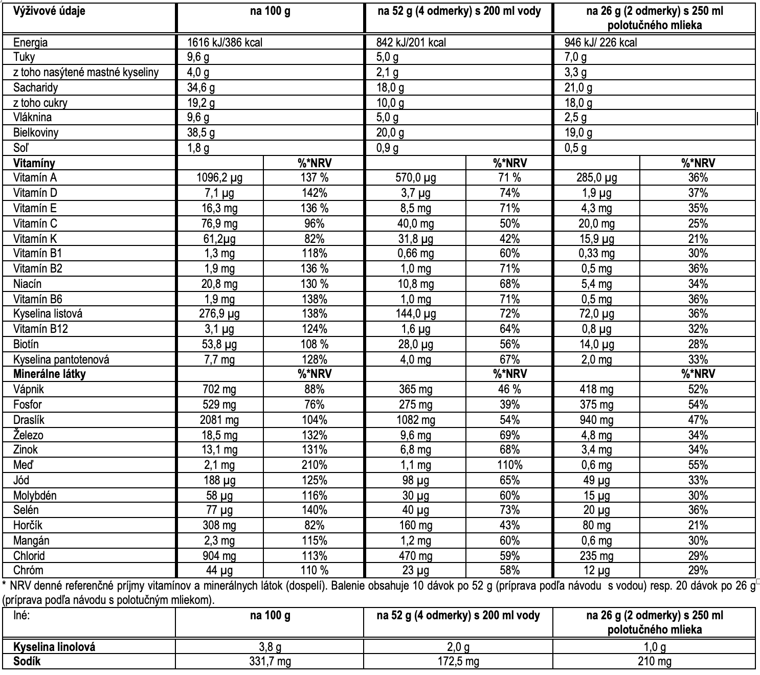 Návod na prípravu: Zmiešajte 4 odmerky (52 g) zmesi s 200 ml vody alebo zmiešajte 2 odmerky (26 g) zmesi s 250 ml polotučného mlieka (Obsah tuku 1,5 %). Dôkladne pretrepte, aby ste vytvorili hladkú a krémovú konzistenciu. Konzumujte. Upozornenia: Náhrada za dávku jedla na účely regulácie telesnej hmotnosti. Použitie náhrady za dávku jedla namiesto jedného z hlavných denných jedál v rámci diéty so zníženou energetickou hodnotou prispieva k udržaniu telesnej hmotnosti po jej znížení. Výrobok je vhodný na zamýšľané použitie len ako súčasť diéty so zníženou energetickou hodnotou a nevyhnutnou súčasťou takejto diéty musia byť aj ďalšie potraviny. Nezabúdajte na dôležitosť primeraného denného príjmu tekutín. Na dosiahnutie tvrdeného účinku je potrebné namiesto jedného hlavného jedla denne použiť jednu náhradu za dávku jedla.