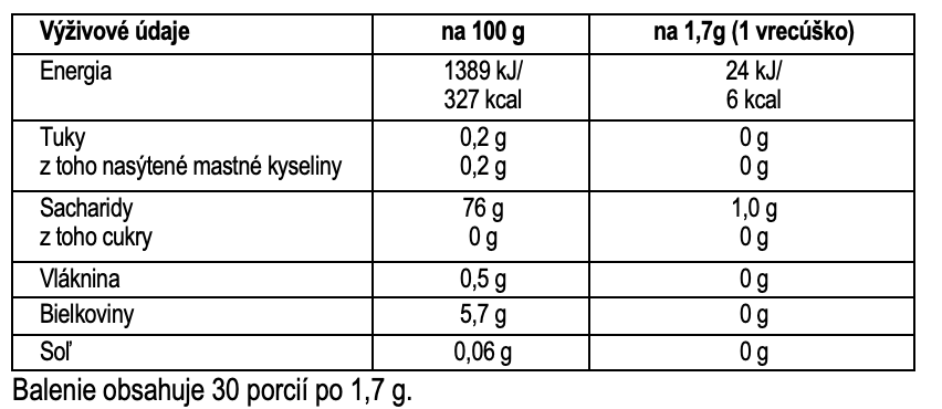 Návod na prípravu: Do šálky nasypte 1 vrecúško zmesi (1,7 g). Zalejte 350 ml horúcej alebo studenej vody, dobre premiešajte.
